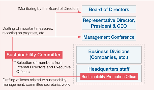Third, it links our management to sustainability. In order to encourage changes in awareness within the organization and rearrange strategies, we aim to organize